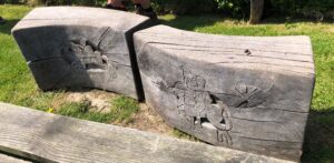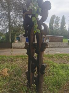 LEGACY A huge hollow elm tree which had already died due to Dutch Elm disease. It has been carved with English and Norman words which have the same meanings. eg. archer (Norman) and bowman (Anglo-Saxon) to highlight the French words which since the Norman Conquest , have been absorbed into the English language.